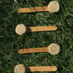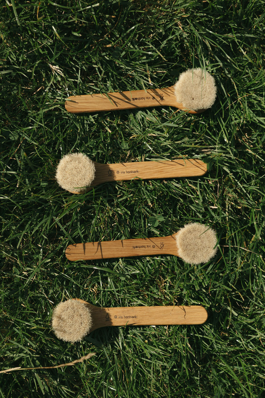 A natural face brush made with goat hair or horse hair bristles and a hand-oiled oak wood handle. Designed for gentle exfoliation, circulation, and radiant skin